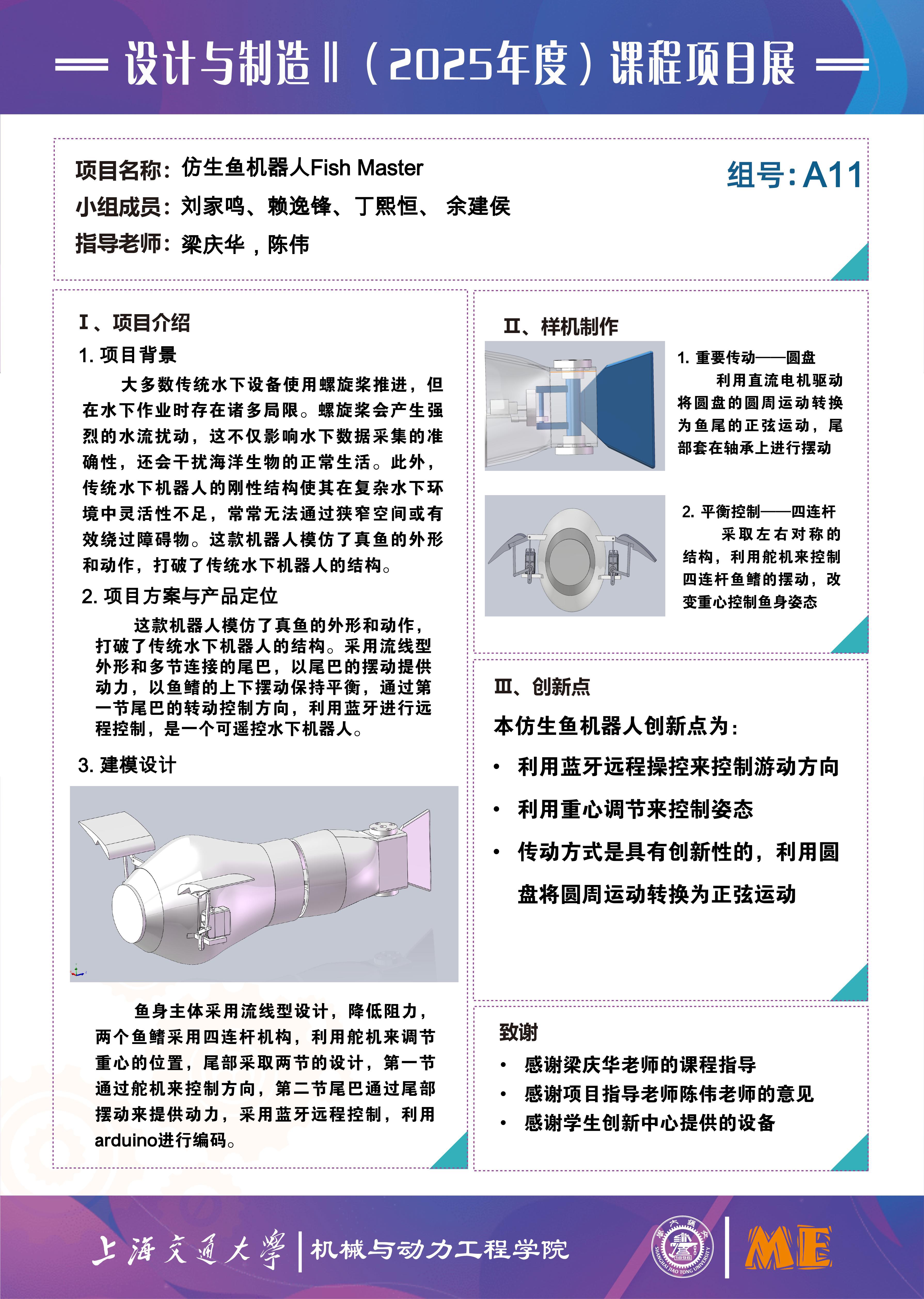 The Fish Master project developed a bionic underwater robot that mimics fish propulsion to overcome limitations of traditional propeller-driven systems, such as noise and poor maneuverability. After a thorough literature review, we selected a motor-driven three-dimensional linkage tail mechanism paired with a center-of-gravity adjustment system for optimal performance and maneuverability. The final design featured a sinusoidal-oscillation tail, four-bar linkage side fins for steering, and waterproof 3D-printed components. Testing confirmed effective linear speed control (3–8V range), reliable steering (55°–125° range), and robust waterproofing. Key innovations included Bluetooth-based remote control, posture adjustment via center-of-gravity manipulation, and a disc mechanism converting rotary motion into sinusoidal tail movement. The robot demonstrated full-directional mobility, meeting all design requirements for applications.