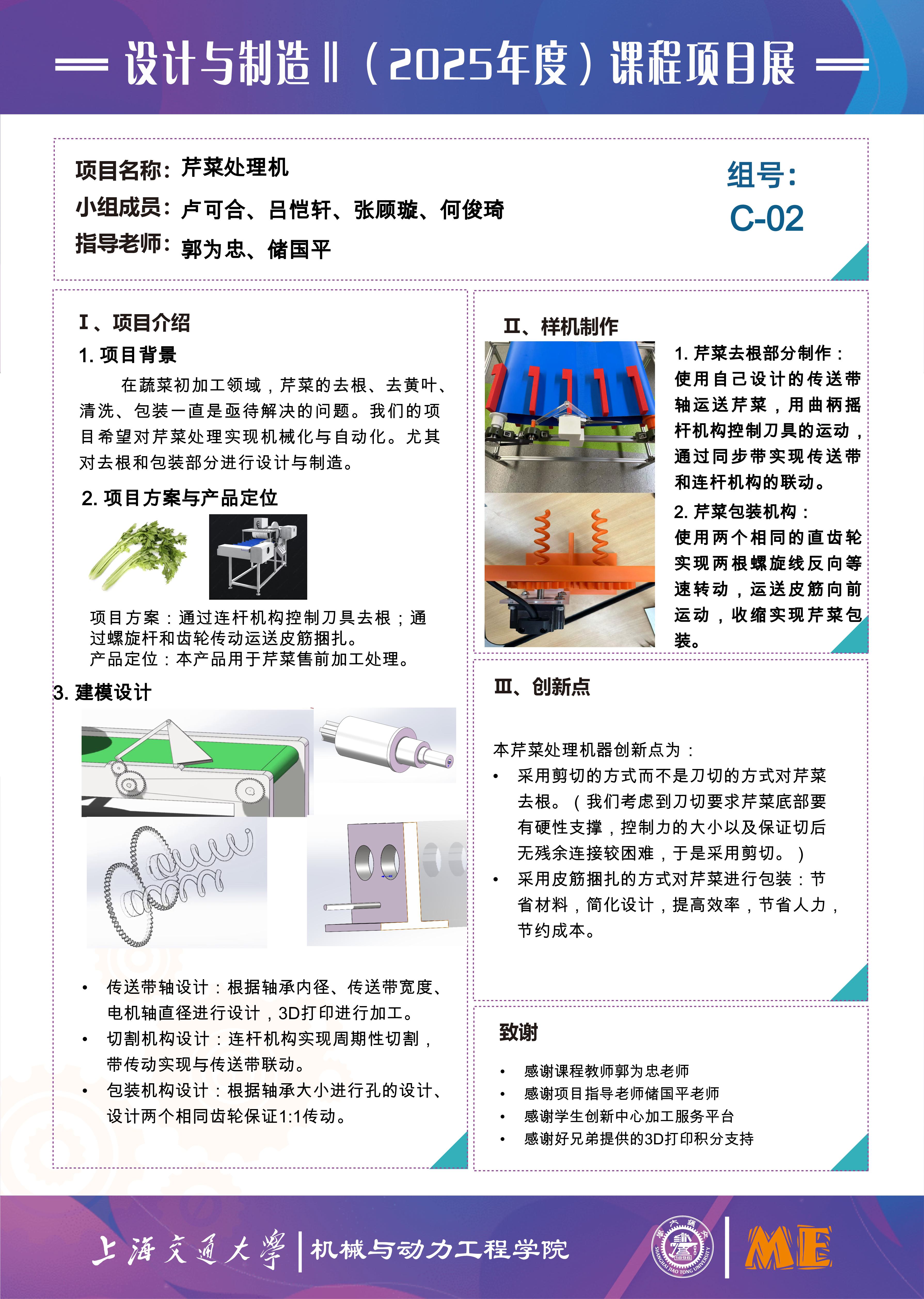 我们的项目成功实现了对芹菜根部的自动化切割和自动化包装。通过设计与制造过程,我们对课程学习的理论知识有了更深的理解。