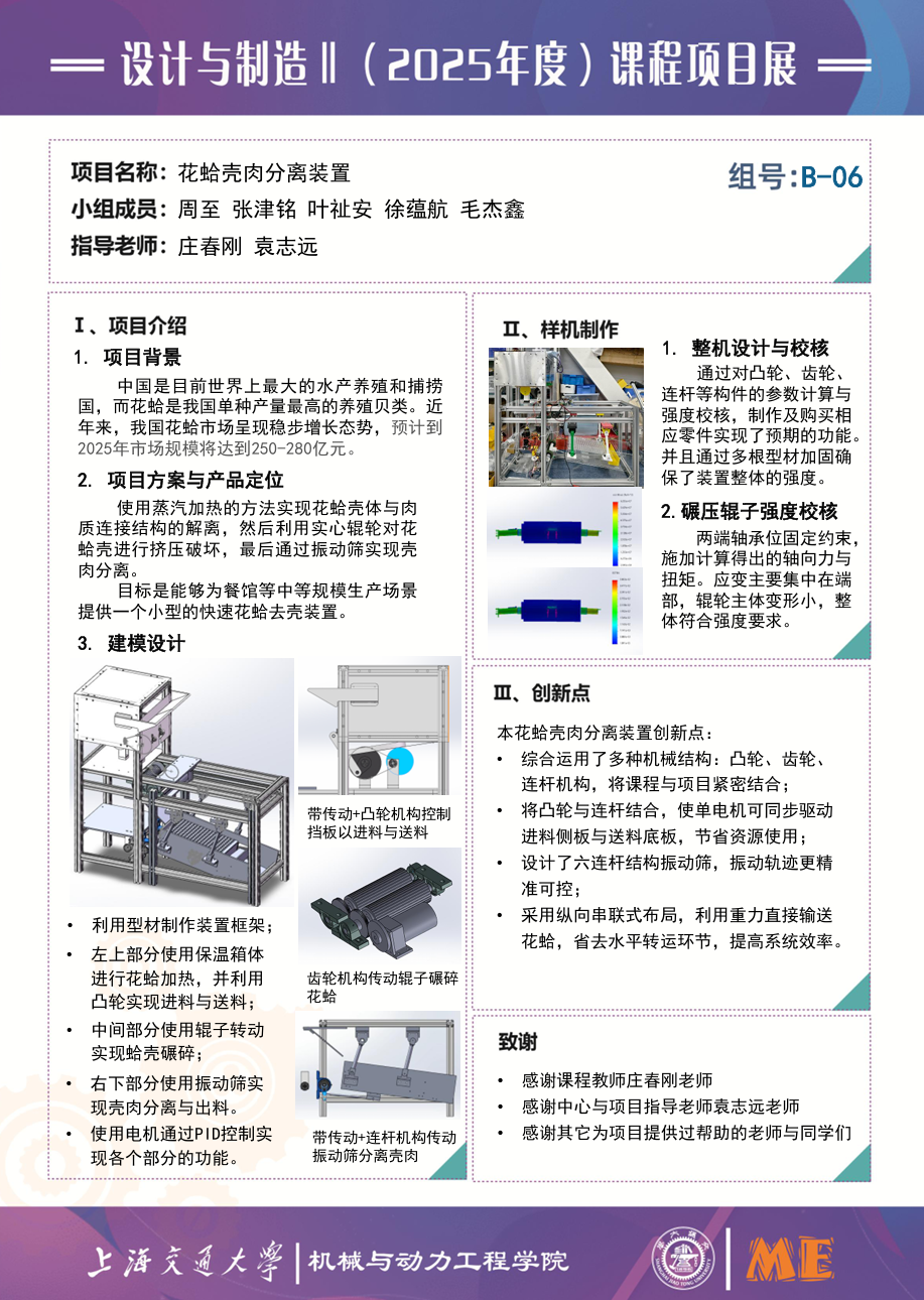 总体而言,本项目已完成小型花蛤壳肉分离装置样机的搭建与模块化集成。加热端成功利用凸轮完成了进料、加热、送料的循环,实现了蒸汽短时加热开壳;碎壳端采用减速直流电机配合调速器与齿轮啮合同步反转双辊轮,但由于辊轮材质较软且脆,在碎壳阶段容易打滑,并且由于压力不足无法完成碎壳;分离端通过前馈 PID 闭环调速保证六连杆振动筛稳定运行,大致能够实现壳片与贝肉的有效分离。总的来说,已经实现了所有需要的运动目标,大体上运行较为稳定,后续可以通过更改辊轮材质以及提高电机功率的方式实现完整壳肉分离流程。