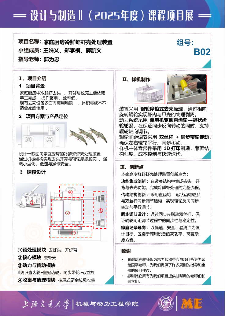 本项目面向家庭厨房鲜虾预处理场景,设计了一款集去虾头、开背与去虾壳于一体的冷鲜虾处理装置。装置采用机械传动与摩擦脱壳原理,通过模块化结构与多机构协同,实现对不同规格虾体的安全、高效处理,兼顾实用性、易清洁性与家庭使用可行性。