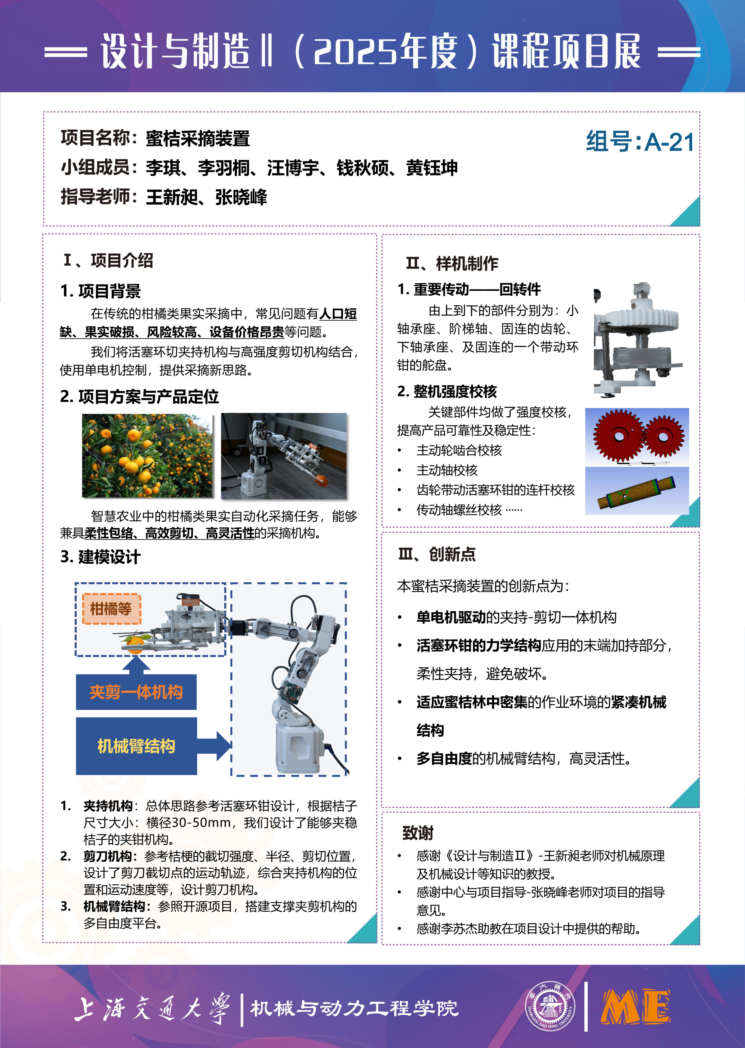 本项目围绕农业果实采摘过程中人工成本高、劳动强度大、作业风险高以及小农户可用设备缺位等现实问题,设计并制作了一套单自由度末端蜜桔采集装置。