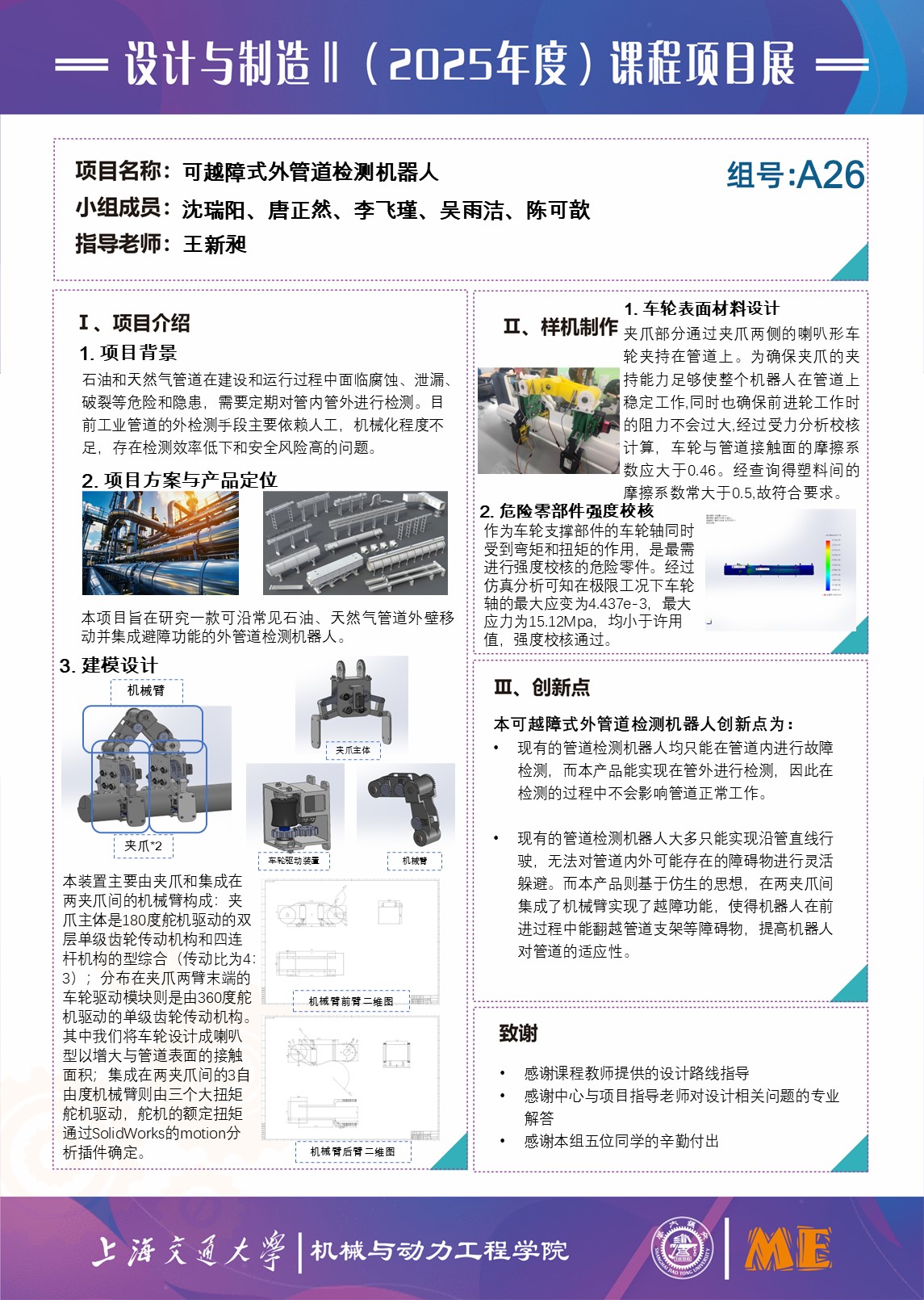 本项目旨在研究一款可沿常见石油、天然气管道外壁移动并集成避障功能的外管道检测机器人。