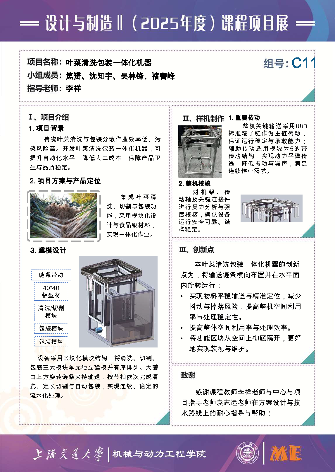 本项目旨在设计并制作一件能够实现清洗、切割与包装的针对大葱的叶菜一体化处理装置,具体目标:设计与实现基于轮带与链轮系的主动力传送装置、自主设计可实现手动夹持的夹持装置、实现无封口式自动包装功能。