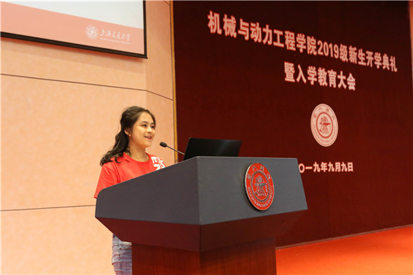刘金新月同学代表2019级本科新生上台发言,讲述了自己与学校的不解之缘,希望在这所心之向往的学府里,不畏风雨,共同成长,走向更美好的未来。