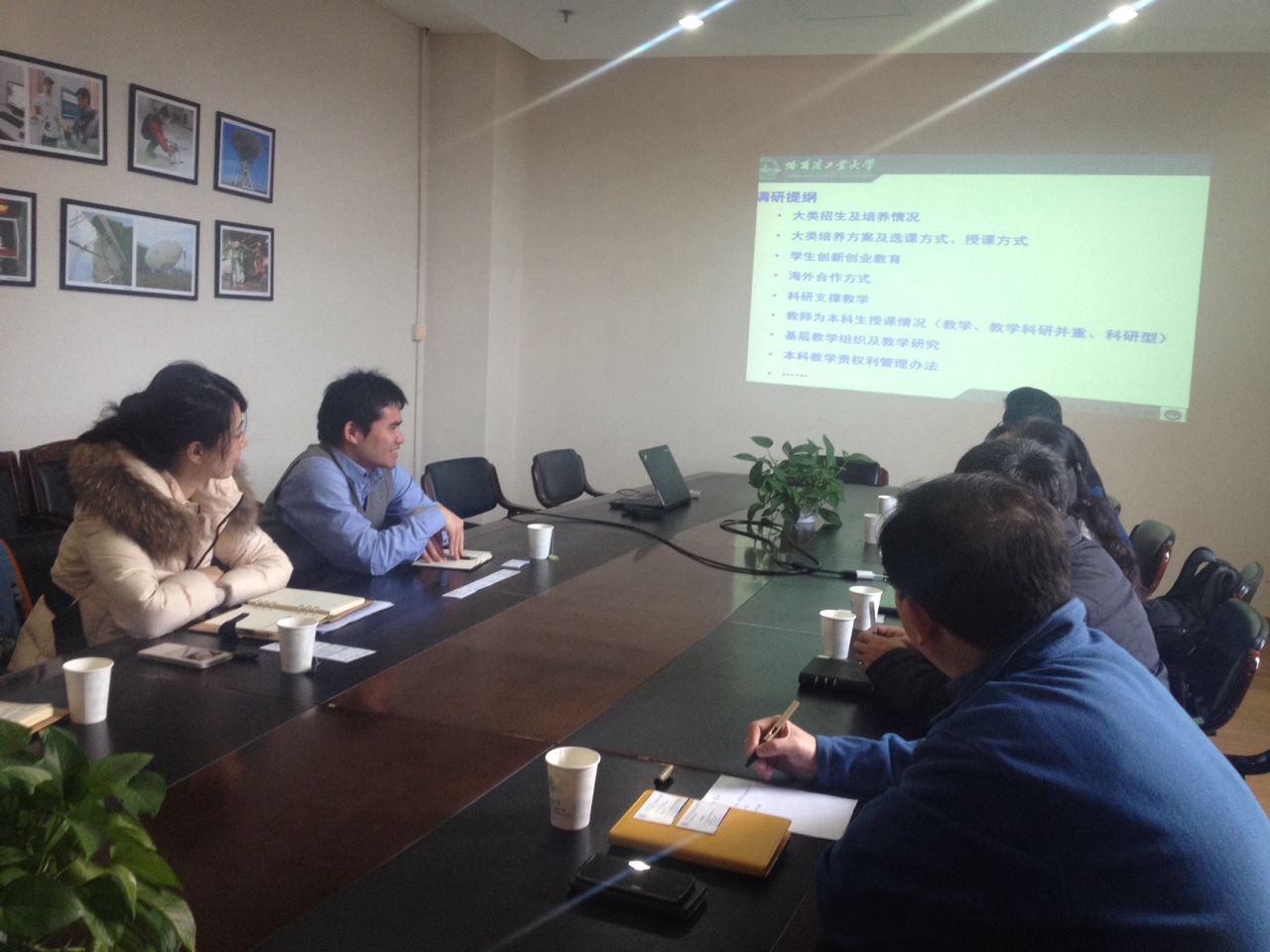 随后,哈工大调研代表与学院本科教学院长章俊良、本科教务办主任吴艳琼、教学人员张杨在机械楼F207对进行了深切调研交谈,双方对其本科教学总体概况进行了介绍,并围绕大类招生及培养情况、大类培养方案及选课授课方式、基层教学组织及教学研究、科研支撑教学、海外合作、学生创新创业教育等方面进行了深入交流。