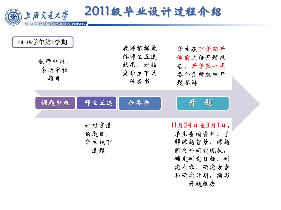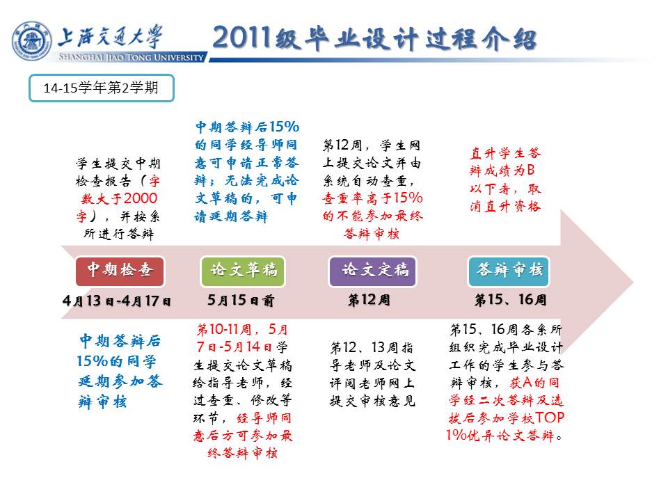 2011级本科生毕业设计(论文)工作的进度安排如下,请各位老师、同学注意时间节点,合理安排毕业设计工作。