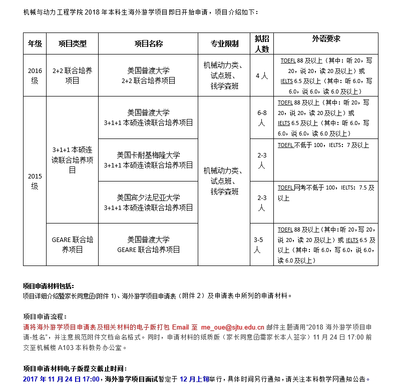 备注:为给予学生充分时间准备材料,纸质版及电子版材料提交时间延长至12月1日17:00,特此说明。 附件1:海外游学项目介绍暨家长同意函