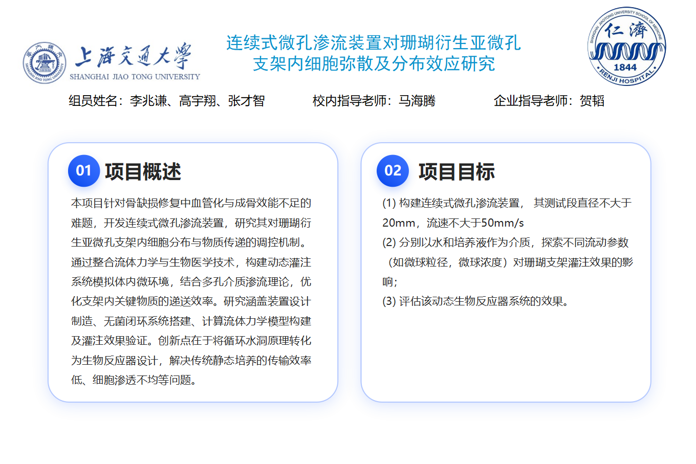 本项目针对骨缺损修复中血管化与成骨效能不足的难题,开发连续式微孔渗流装置,研究其对珊瑚衍生亚微孔支架内细胞分布与物质传递的调控机制。通过整合流体力学与生物医学技术,构建动态灌注系统模拟体内微环境,结合多孔介质渗流理论,优化支架内关键物质的递送效率。研究涵盖装置设计制造、无菌闭环系统搭建、计算流体力学模型构建及灌注效果验证。创新点在于将循环水洞原理转化为生物反应器设计,解决传统静态培养的传输效率低、细胞渗透不均等问题。