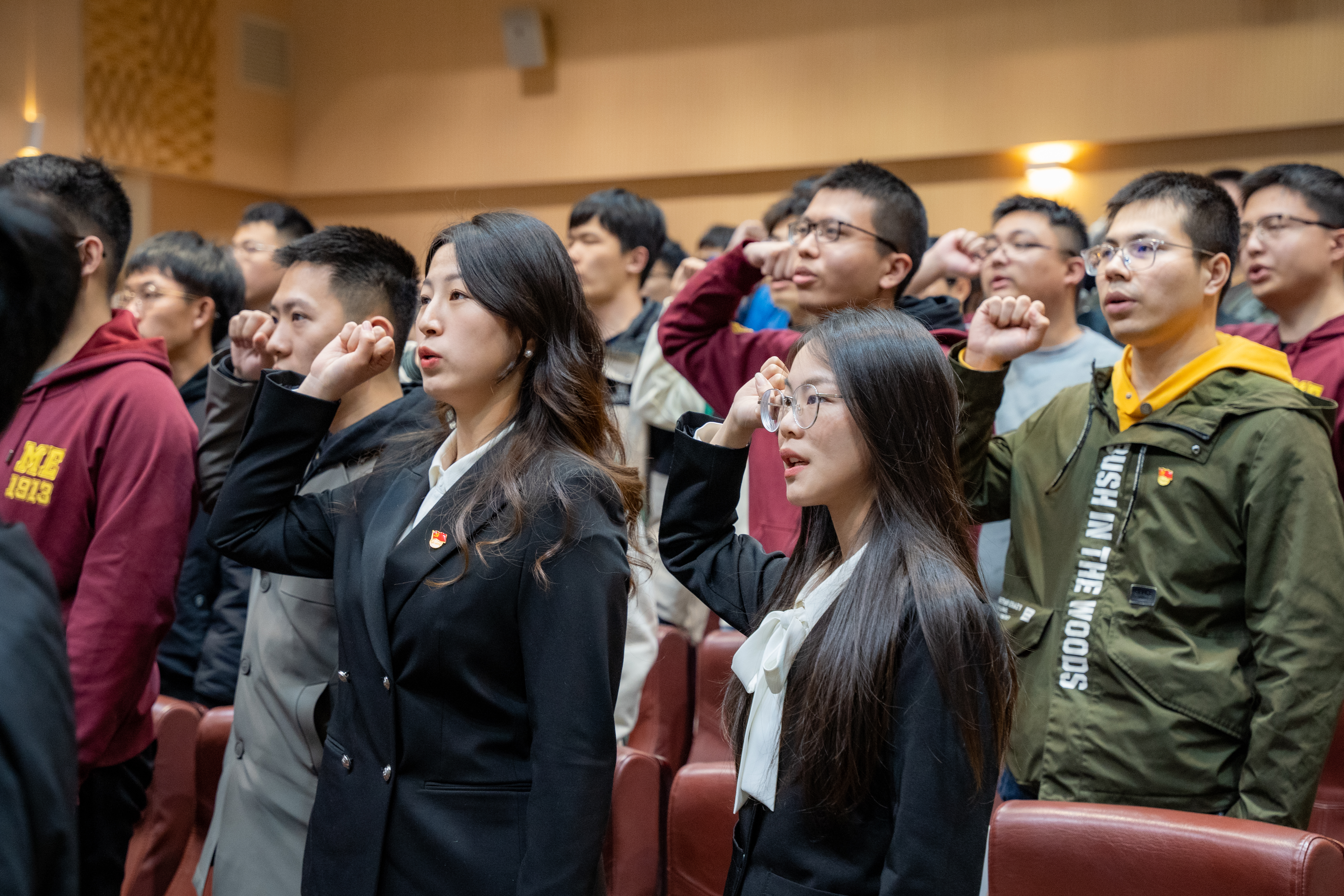 全体毕业生党员在鲜红的党旗前庄严肃立,高举右拳,重温入党誓词。