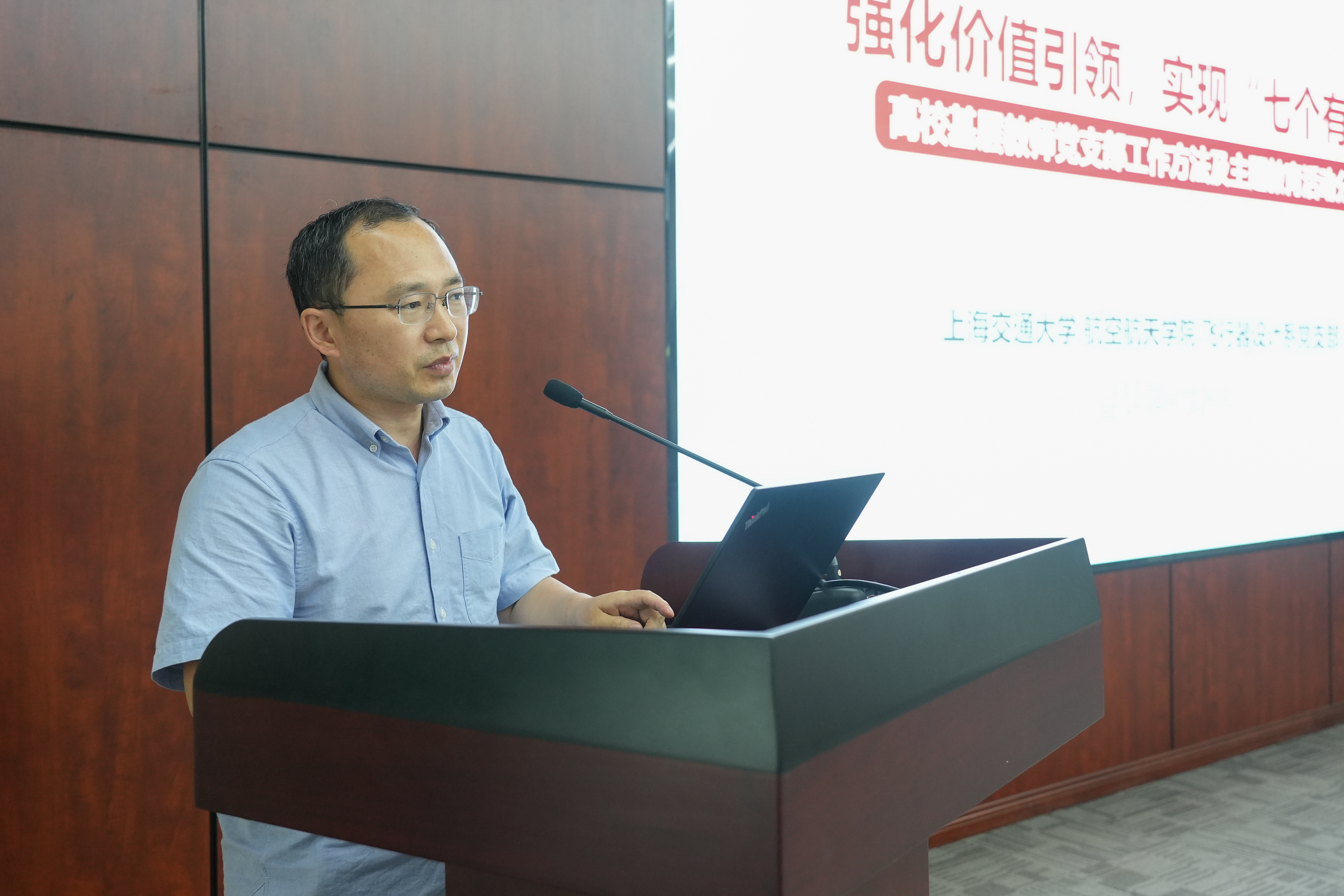 航空航天学院飞行器设计系党支部书记于哲峰介绍支部以创建“钱学森日”主题党日、打造“不忘初心 空天强国”支部品牌活动为抓手,强化价值引领的工作方法,分享支部围绕一个主题丰富内容、创新形式、深化成效,成功获批学校十佳优秀主题党日案例的经验,以及“七个有力”的具体做法。