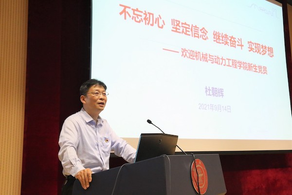 杜朝辉以“不忘初心,坚定信念,继续奋斗,实现梦想”为主题,为新生党员带来第一节主题党课。杜朝辉首先谈到,学习党史是每位党员的必修课,他带领新生党员一同回顾党的历史,学习伟大建党精神,列举学院学子在党的领导下开展反帝反封建斗争、抗日救亡运动和解放战争期间爱国民主运动中的的英雄事迹,如1944年毕业前投笔从戎、在柳州战役中英勇牺牲的杨大雄,1947年在护校运动中自驾火车去南京请愿的傅家邦、丁仰炎等。中国共产党从上海、嘉兴南湖启航,值此建党一百周年之际,他祝愿新生同学在德赢vwin体育官网登录开启新的人生征程。他对新生党员提出三点要求。一是要不忘初心,强化党员意识。他结合习近平总书记在庆祝中国共产党成立100周年大会上的讲话,阐释共产党人的初心和使命,要求新生党员信仰坚定,做到“四讲四有”、“四个合格”,在新时代不懈奋斗。二是要志存高远,勇于担当作为。他以人民科学家钱学森学长以及以林忠钦校长为代表的制造强国的践行者为例,激励同学们要传承科学精神,引领建功新时代,期许党员同学长怀丹心深耕勤垦,在自己的领域发光发热。三是要努力研学,争做时代模范。他以刘智崑、钱小石等青年学者的奋斗经历为例,希望同学们崇尚科学、创新攻坚。他以同学们身边的优秀党员代表党嘉强、高娇等为例,勉励新生党员矢志报国,不负青春,志存高远,脚踏实地,成长为具有家国情怀、国际视野和行业志向的一流拔尖创新人才。