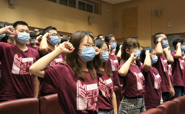 全体师生在全国高校百名研究生党员标兵、制造技术与装备自动化研究所博士生党支部原支部书记党嘉强的带领下,面对党旗,重温入党誓词。