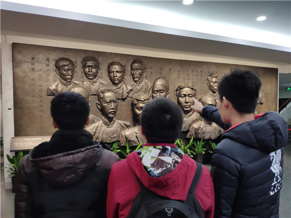 同学们秩序井然地入场,抬头便是巨幅铜质浮雕像,建党先驱们如炬的目光,瞬间令参观者重回那个战火纷飞的年代,唤起了大家对建党初期坎坷历史的点滴记忆。