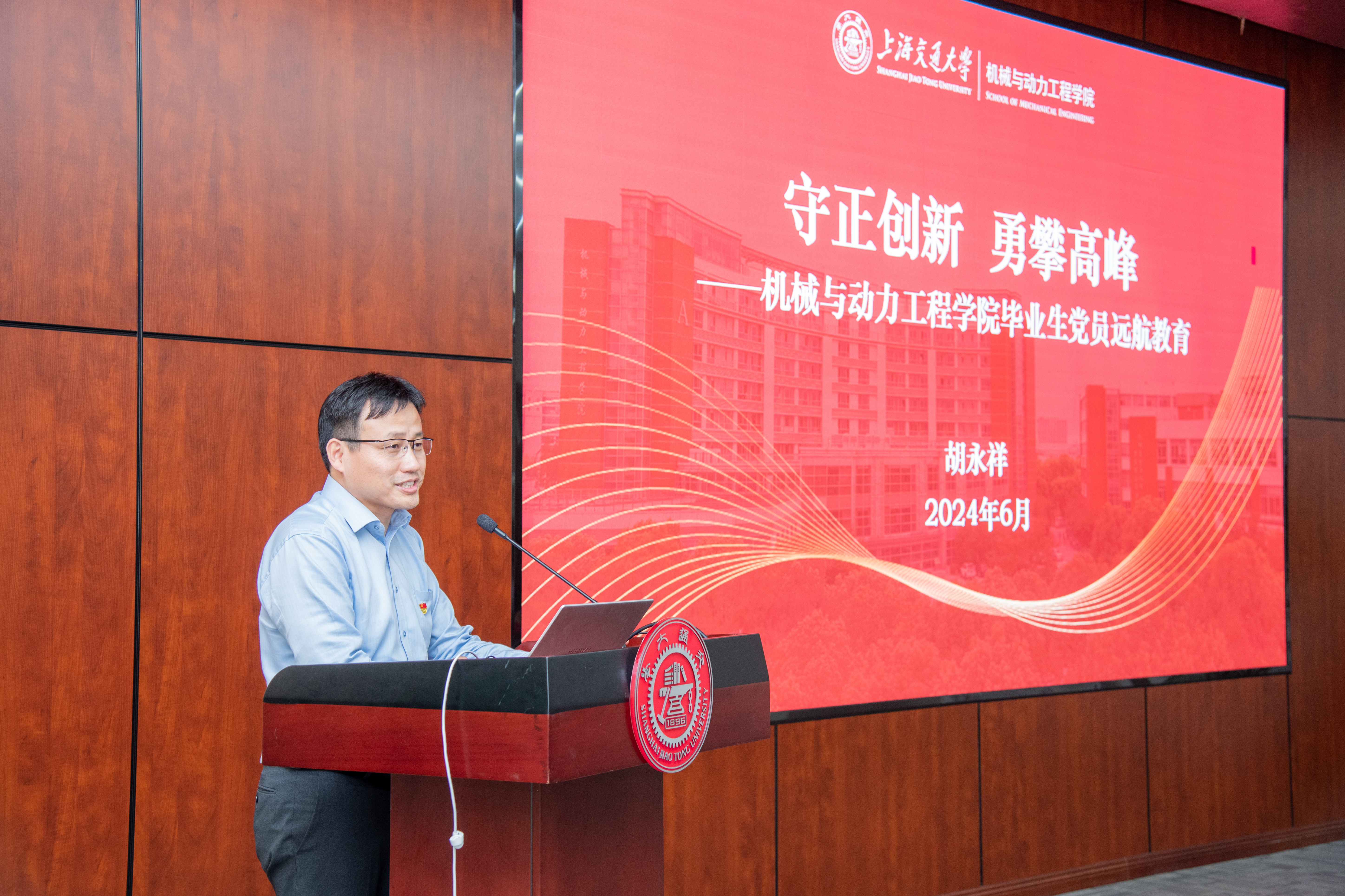 胡永祥以“守正创新,勇攀高峰”为主题展开远航教育党课。他对毕业生党员提出四点期望和要求。一是要不忘初心,坚定理想信念。他分析了百年未有之大变局背景下的国际形势和国家发展战略布局,希望毕业生党员们成为具有创新精神和实践能力、德才兼备的“高层次创新型人才”。二是要志存高远,脚踏实地工作。他回顾了中国共产党和学院的发展历史,介绍钱学森、顾诵芬等杰出校友的奋斗历程,鼓励大家在打好基础、学好知识的同时树立远大的理想抱负。三是要担当作为,不负时代使命。他讲述优秀毕业生校友的故事,号召大家未来选择到国家需要的岗位建功立业。四是要奉献青春,焕发绚丽光彩。他强调党纪学习教育的目的和要求,希望大家进一步强化纪律意识,自觉讲政治,坚持底线思维。