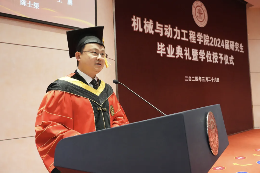 3月26日,德赢vwin体育官网登录举行2024届研究生毕业典礼暨学位授予仪式。学院院长杜朝辉,党委书记胡永祥,副院长李玉阳、夏唐斌,导师代表刘成良、曹其新、欧阳华,研究生班主任张希、潘尔顺、熊进标,上海伯镭智能科技有限公司联合创始人兼CTO、2007届本科、2014届博士校友杨扬,以及2024届研究生(含MEM研究生)毕业生等参加了典礼。典礼由学院党委副书记张执南主持。