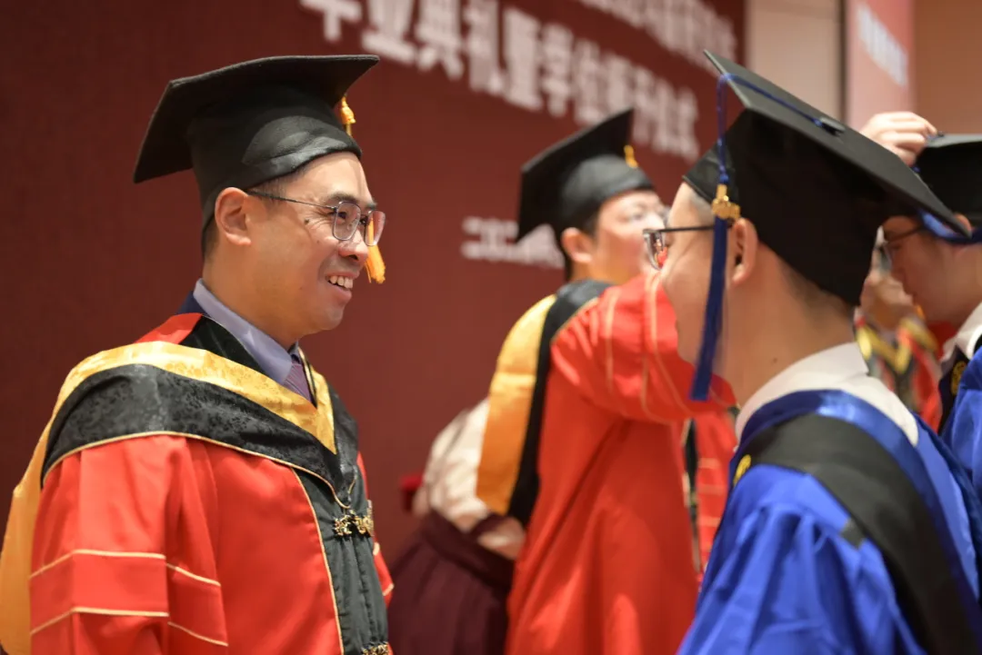 在庄严隆重的学位授予仪式环节,导师为毕业生依次拨穗正冠,颁发学位证书。