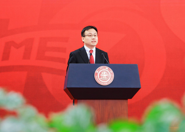 1982届院友、上海交大讲席教授倪军作为嘉宾代表发言,表达对母校培养的感激之情和对当年任教老师的崇高敬意。他结合自己的学习经历和在美国密西根大学任教、促成中美高校国际化办学突破、担任宁德时代首席制造官的工作经历,强调了跨学科学习和交叉合作的重要性,希望师生校友积极面向国家战略需求,深化产教融合,把论文写在祖国大地,为推动新一轮工业革命科技创新和社会进步贡献力量。