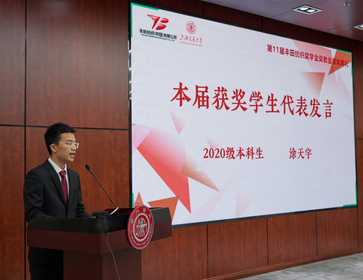 获奖学生代表涂天宇结合自身学业与心路历程,表示将牢记饮水思源、爱国荣校的校训,脚踏实地、追求卓越,成为有理想、有能力、有担当的新时代青年。会上播放了往届获奖学生发展情况视频,往届获奖学生表达了对丰田纺织的感谢和祝福,表示将志存高远、踔厉奋发,以行动书写精彩人生。杨丽丽介绍了丰田纺织公司和奖学会的相关情况。
