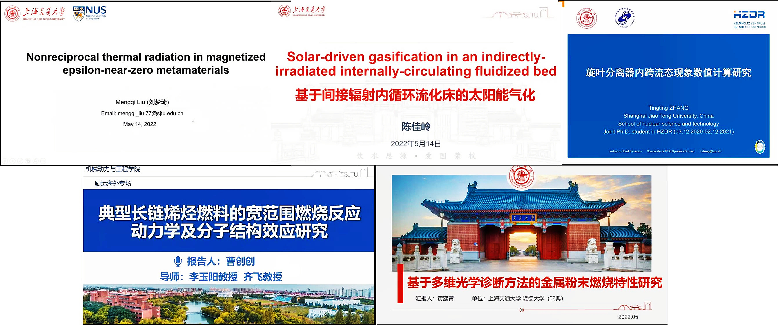 德赢vwin体育官网登录德赢vwin体育官网登录制冷与低温工程研究所博士研究生陈佳岭、航空动力研究所博士研究生曹创创、工程热物理研究所博士研究生刘梦琦、核科学与工程学院博士研究生张婷婷、叶轮机械研究所博士研究生黄建青,分别围绕“基于间接辐射内循环流化床的太阳能气化技术”、“典型长链烯烃燃料的宽范围燃烧反应动力学及分子结构效应研究”、“近零磁化超材料中的非互易热辐射技术”、“叶片式气液分离器形态自适应混合模型的验证技术”、“基于多维光学诊断方法的金属粉末燃烧特性研究”进行了分享。