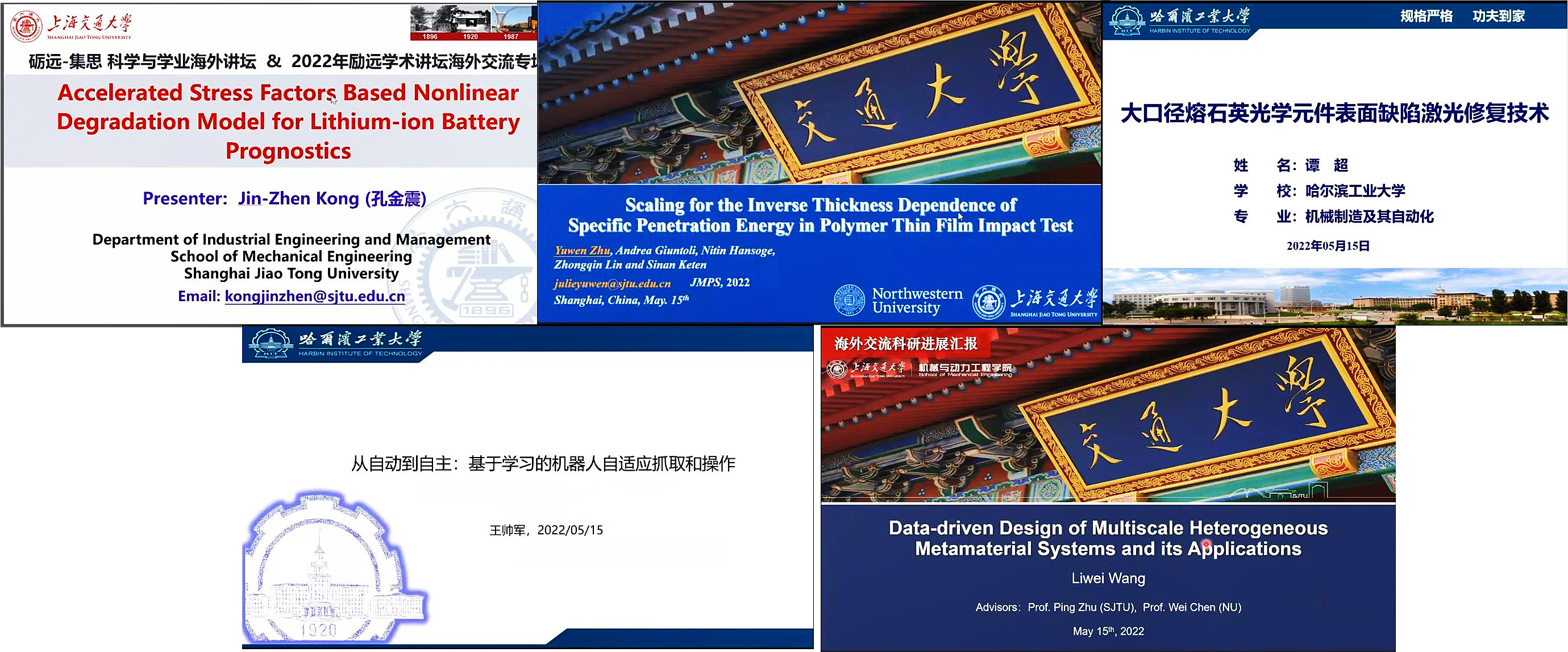 哈尔滨工业大学博士研究生王帅军、谭超,德赢vwin体育官网登录德赢vwin体育官网登录薄板结构制造研究所博士研究生朱宇文、智能汽车研究所博士研究生王力为、工业工程与管理系博士研究生孔金震,分别围绕“机器人从自动到自主的自适应抓取和操作技术”、“高功率激光装置中熔石英光学元件表面缺陷激光修复技术研究进展”、“在聚合物薄膜冲击试验中、比穿透能与厚度成反比关系的标度研究”、“数据驱动的多尺度非均质超材料系统设计及其应用研究”、“基于加速应力因子的锂离子电池非线性退化预测模型的研究”进行了分享。