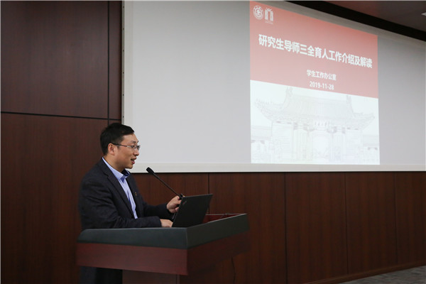 杜朝辉详细介绍了学院和学校在博士生人才培养和导师育人工作方面的发展历程和重大举措,强调了导师作为第一责任人在立德树人、教书育人方面的重要性,希望导师们以身作则,严谨治学,给学生更多关爱,创造更浓厚的学术氛围,培育出更多志存高远、爱国爱校、学术一流的拔尖人才。