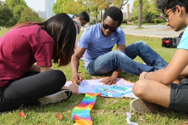 风和日丽、绿草如茵,“两人三足”的破冰游戏拉近了彼此距离。大家拿起画笔自由发挥,制作属于自己的风筝,并起了名字。随后留学生们相互配合,完成了搭骨架、捆线等准备工作。当风轻借力,一举入高空,一只只风筝乘风而起,在蓝色的幕布上划出优美轨迹。