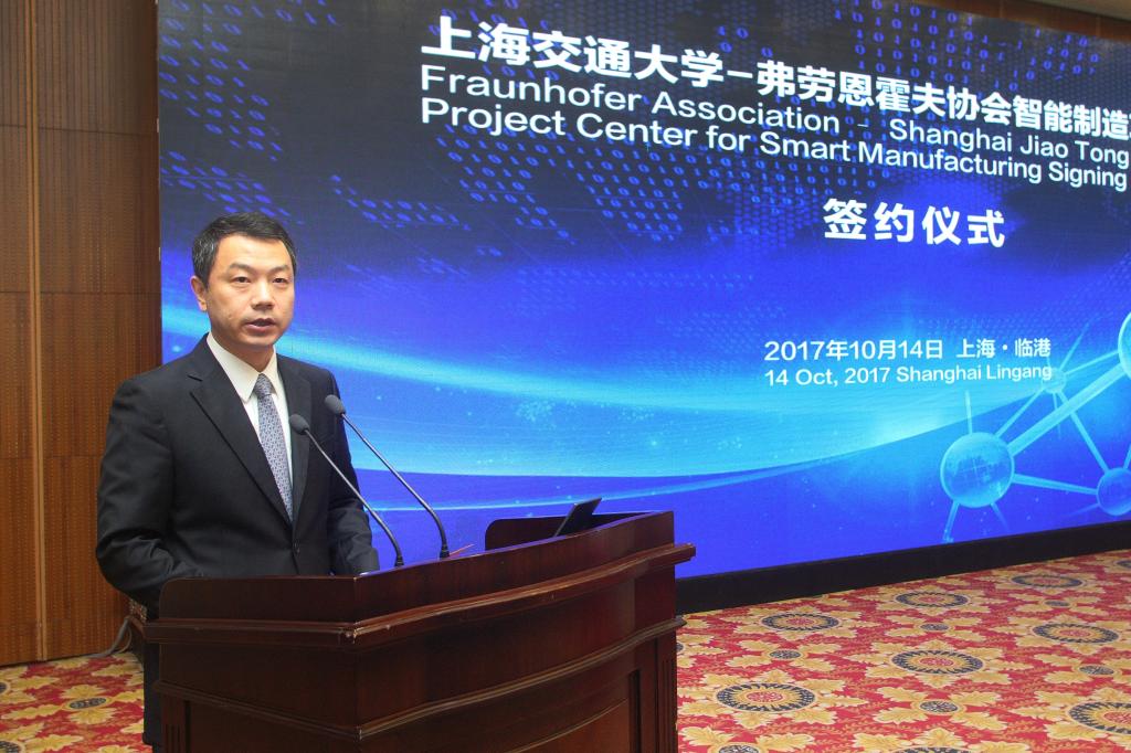 黄瓯副主任代表上海市经济与信息化委员会发言,表达了对项目中心落户临港的祝贺。他表示,上海市委、市政府高度重视发展智能制造,上海市经信委将按照“以释放带动应用,以应用带动集成,以集成带动装备”的推进思路,实施智能制造应用示范性工程,打造全国智能制造的应用高地、核心技术的策源地和系统解决方案的输出地。他认为,弗劳恩霍夫协会与上海交大的强强联合,将有利于上海整合全球优势资源,加快智能制造关键技术的研发和成果的转移孵化,将有力地支撑临港智能制造中心建设,助力上海市建设具有全球影响力的科技创新中心。