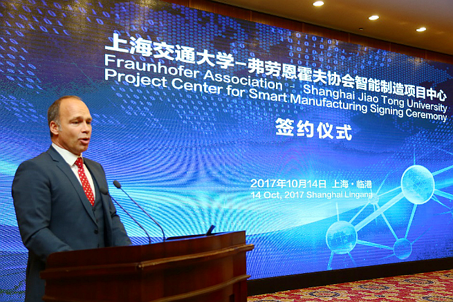 Thomas BAUERNHANSL所长代表弗劳恩霍夫协会致辞,向所有支持弗劳恩霍夫协会在中国组建第一个项目中心的各界人士表示感谢。他认为中德双方的合作目标是开展信息物理系统的研究、在上海建立未来制造系统的示范线,同时在研究生培养、企业人才培训、企业技术服务等方面联合开展工作,建立起中德双方的长期合作。