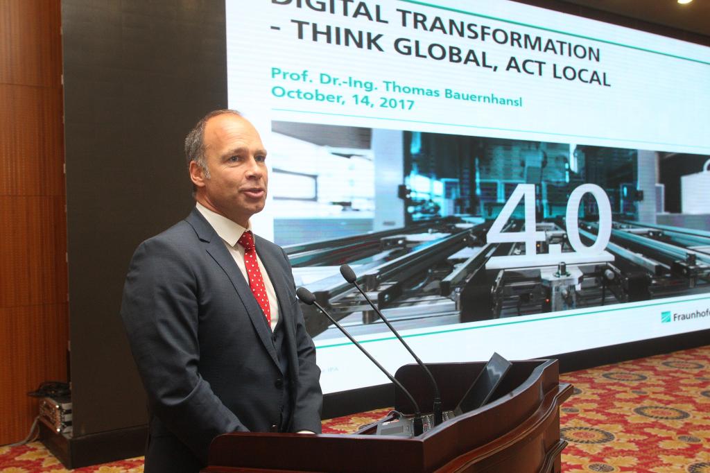 最后,Bauernhansl教授作了题为“Digital Transformation——Think Global, Act Local”(数字化转型——全球视野、行动上海)的报告,介绍了弗劳恩霍夫IPA研究所及其在德国工业4.0领域取得的成就,论述了数字化转型的发展现状和技术趋势,阐释了工业4.0的核心概念与智慧工厂的关键要素,展示了德赢vwin体育官网登录-弗劳恩霍夫协会智能制造项目中心的广阔未来。